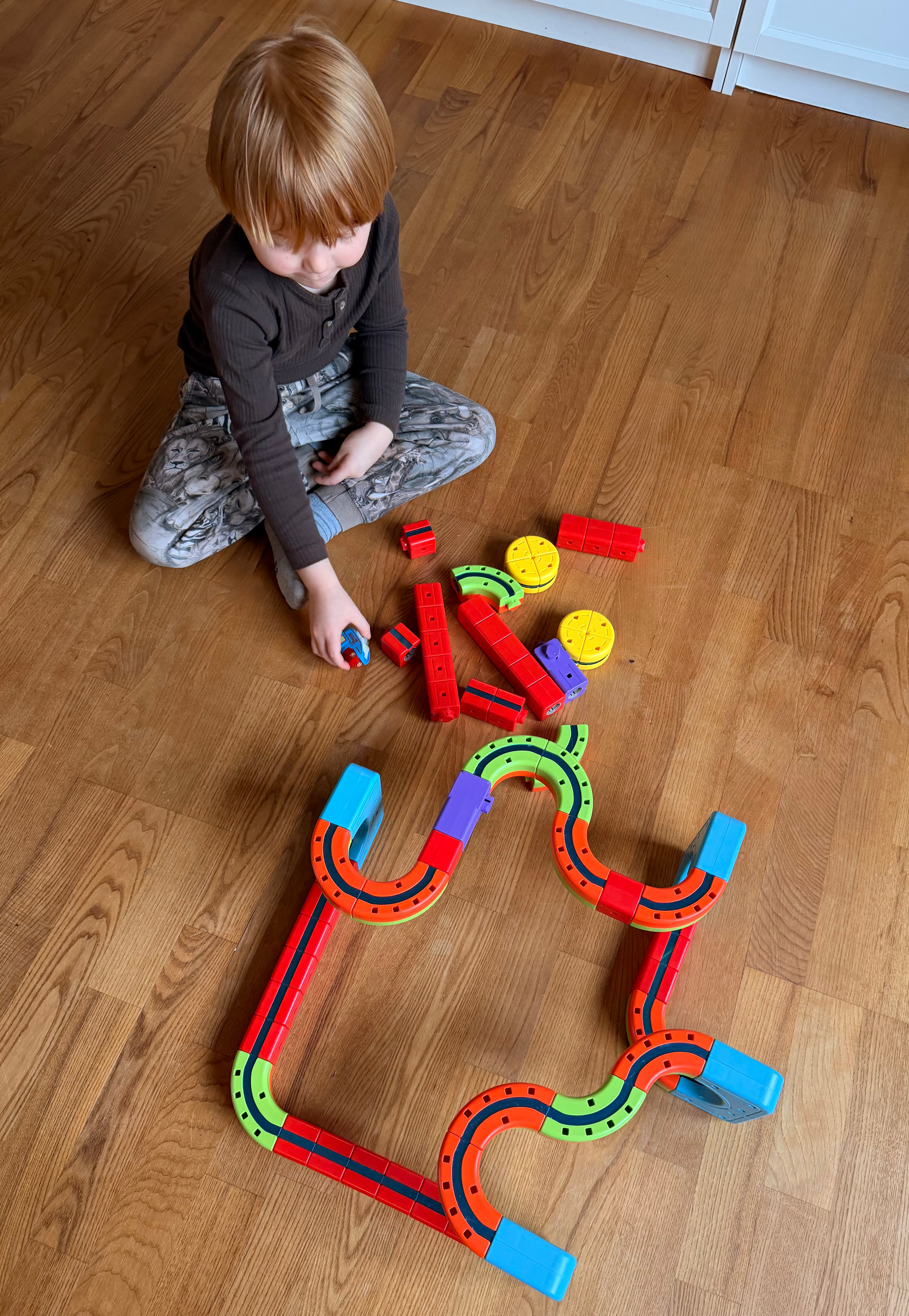 Sættet består af 68 farverige dele, som nemt kan samles til spændende baner og konstruktioner. Børn kan bygge, ombygge og eksperimentere igen og igen – kun fantasien sætter grænser.